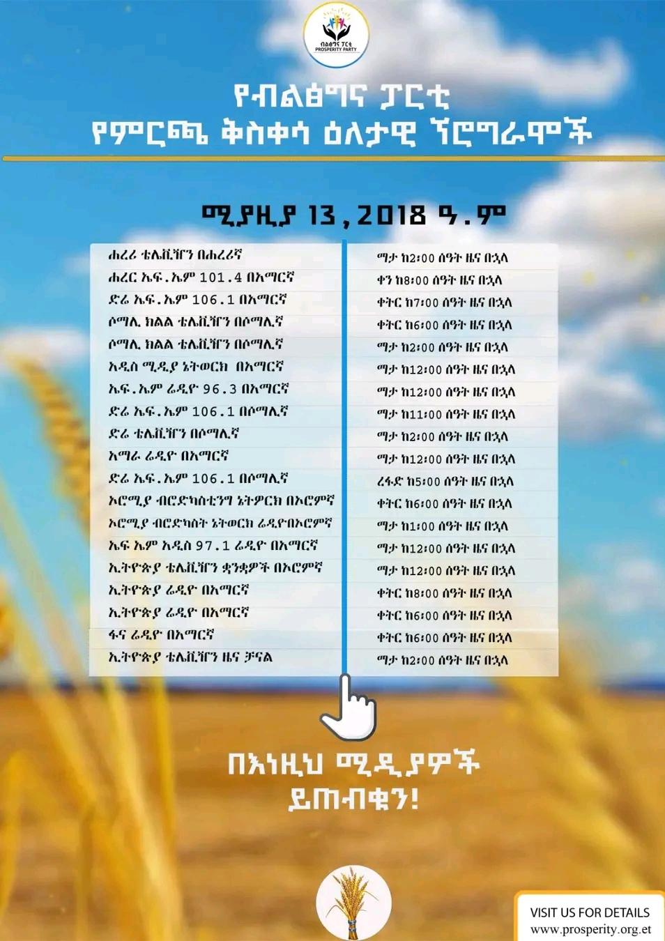 የብልፅግና ፓርቲ የምርጫ ቅስቀሳ ዕለታዊ ኘሮግራሞች ሚያዚያ 13 ,2018 ዓ.ም